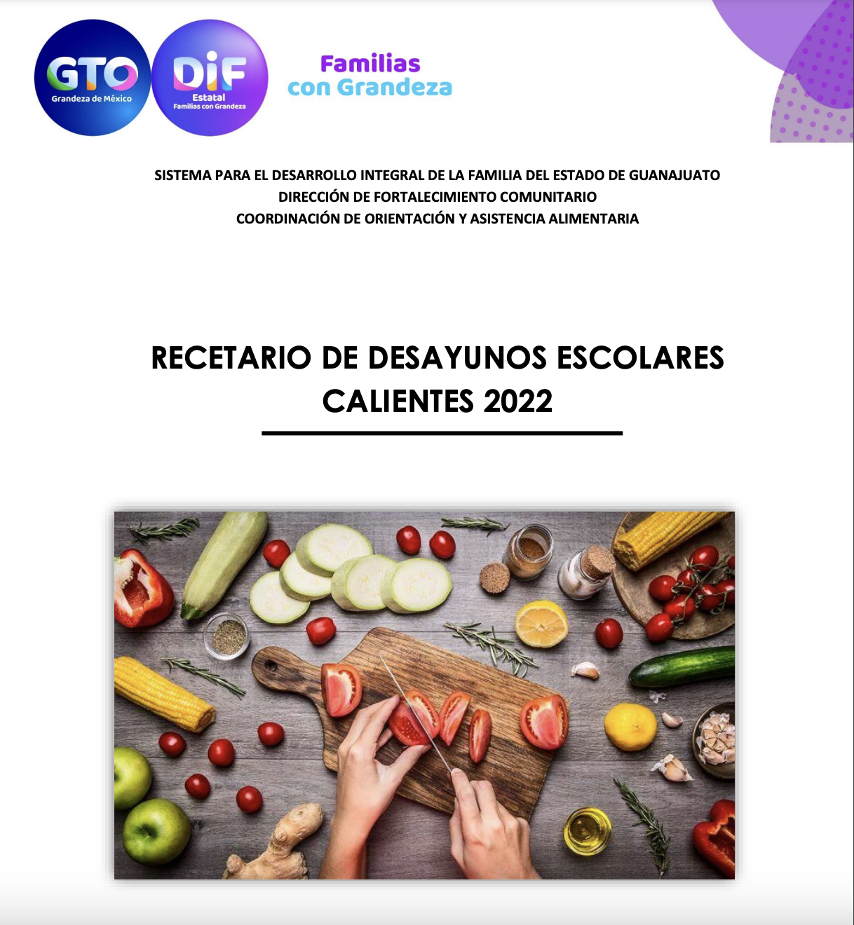 Descubre este recetario con 20 menús cíclicos ideales para el programa de Desayunos Escolares Calientes 2022, que promueve una alimentación equilibrada con recetas nutritivas y sencillas para preparar, cumpliendo con los criterios de calidad nutricia establecidos.